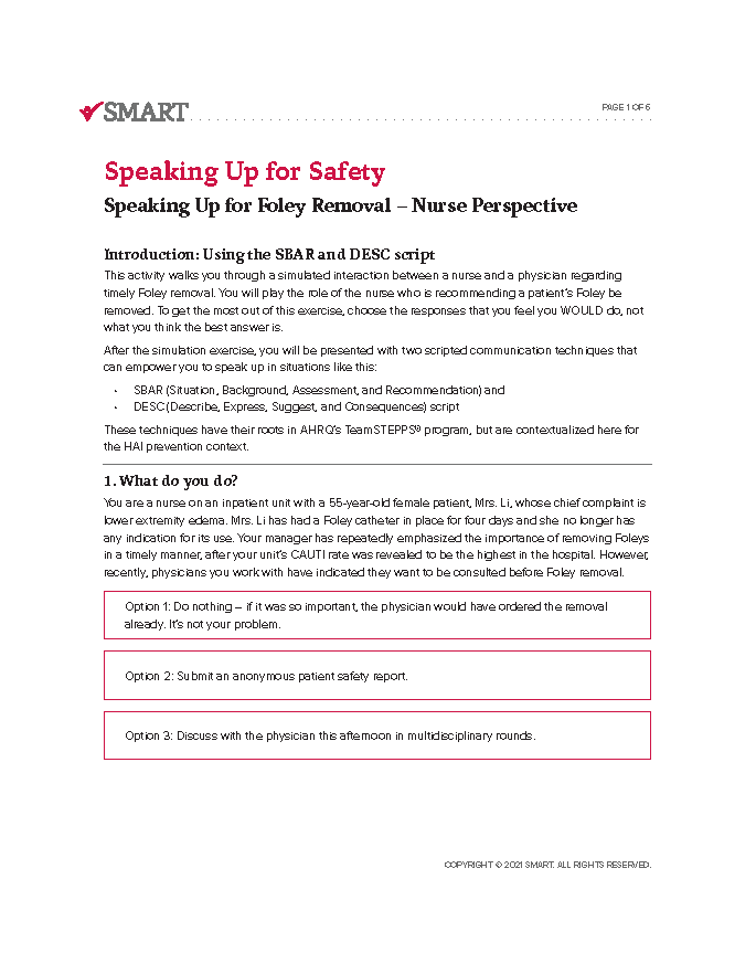 This presentation allows your team to walk through a simulation of an interaction of a nurse with a physician around a lack of timely Foley removal. You will play the role of the nurse.