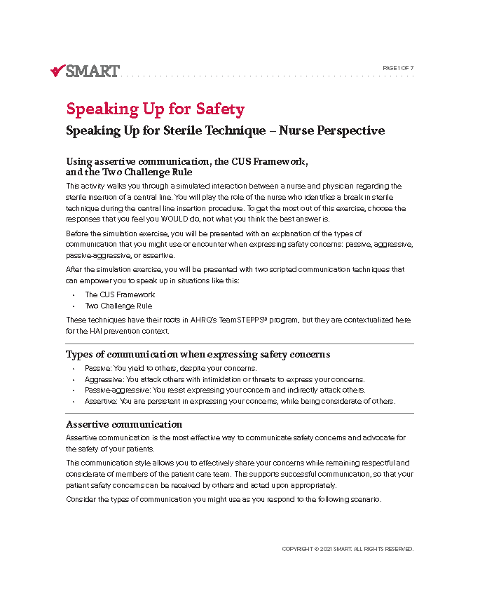 This activity walks you through a simulated interaction between a nurse and physician regarding the sterile insertion of a central line. You will play the role of the nurse who identifies a break in sterile technique during the central line insertion procedure.